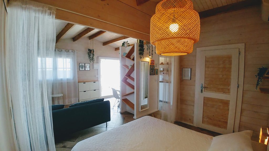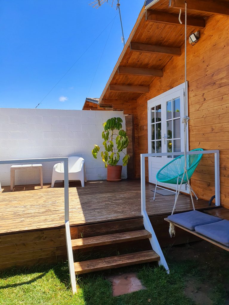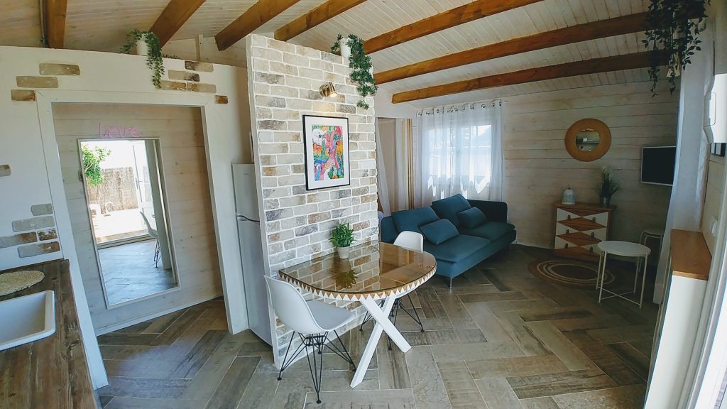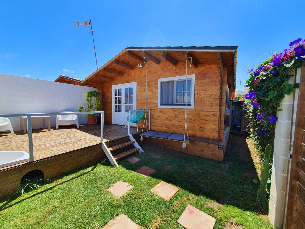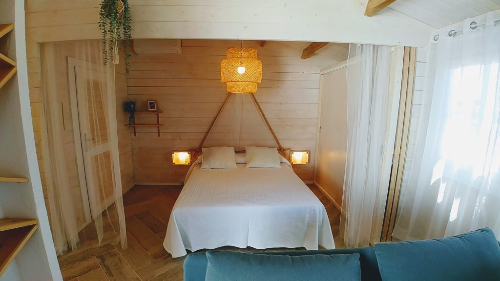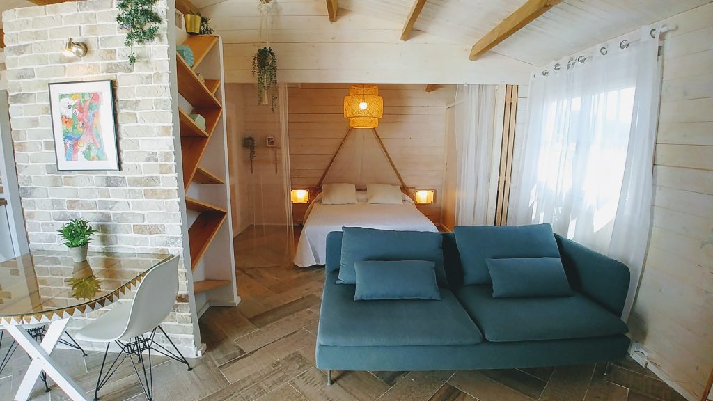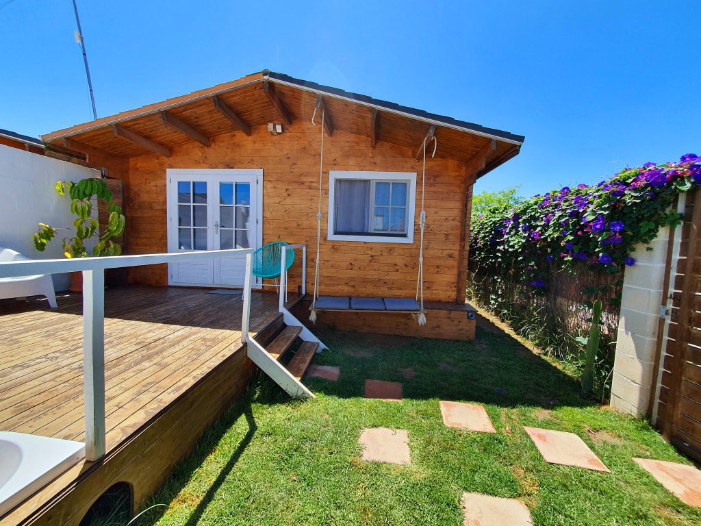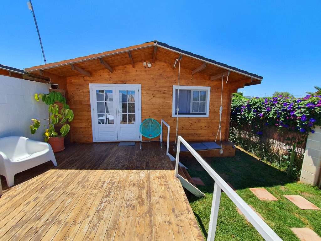 Luminosa cabaña situada en el Palmar de Vejer, a unos 10 minutos a pie de la playa. La cabaña de 36 m² es un espacio abierto (excepto el baño), equipada con cama de matrimonio de 150 cm (queen size), sofá de tres plazas, si lo hace cama es individual. Capacidad para 3 adultos o dos adultos con dos niñ@s pequeñ@s.