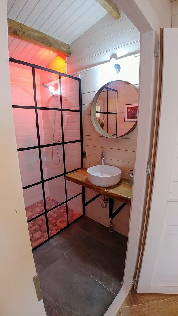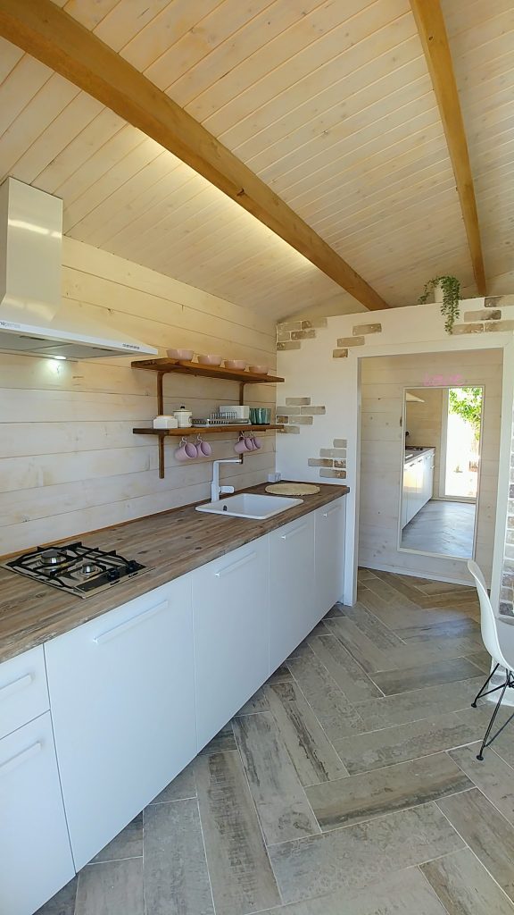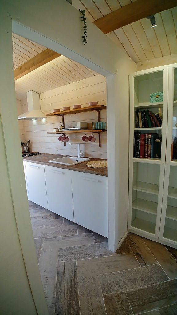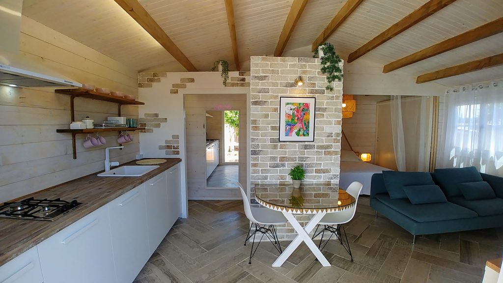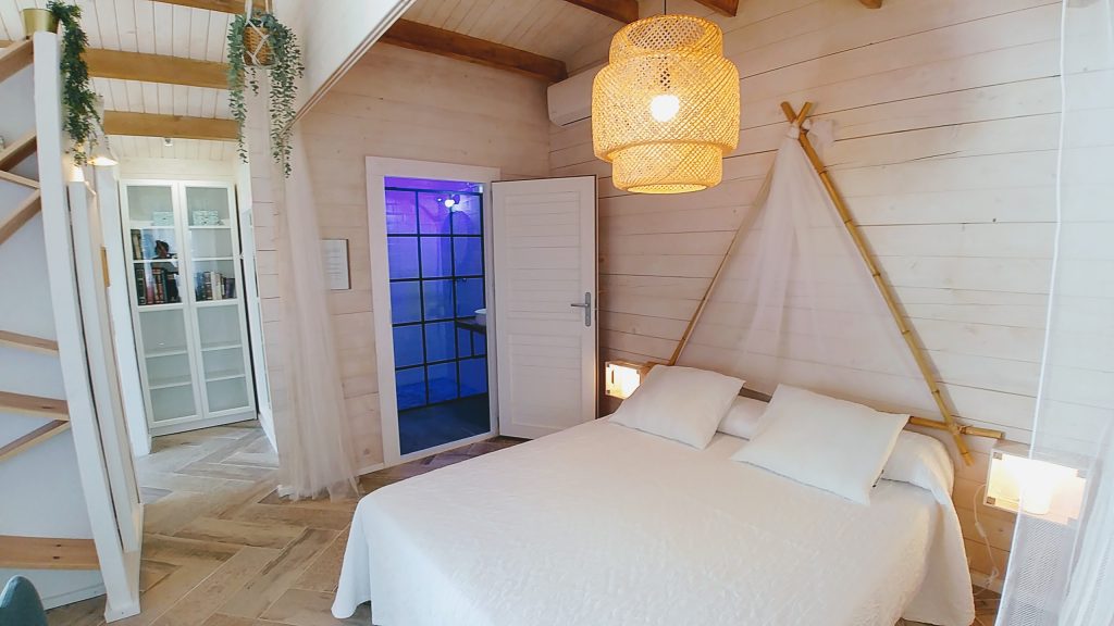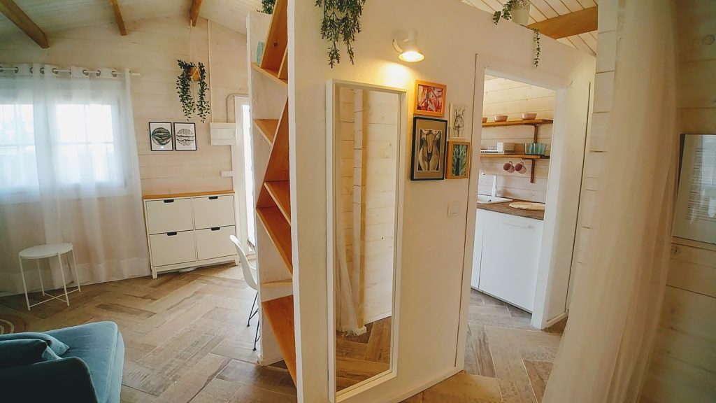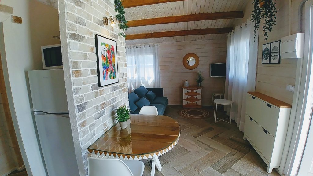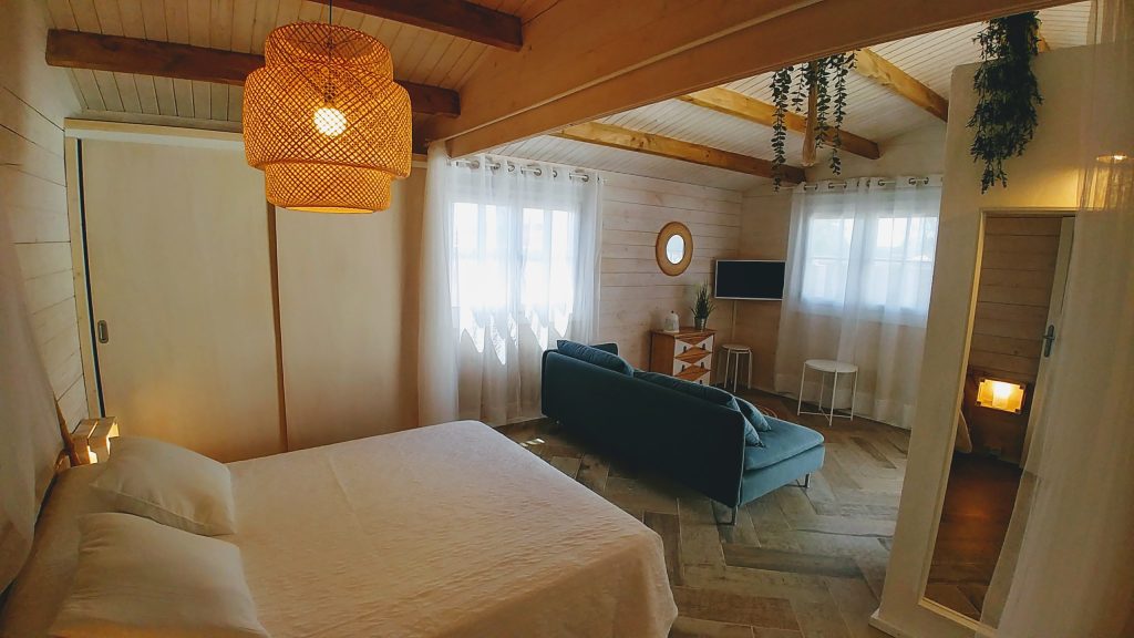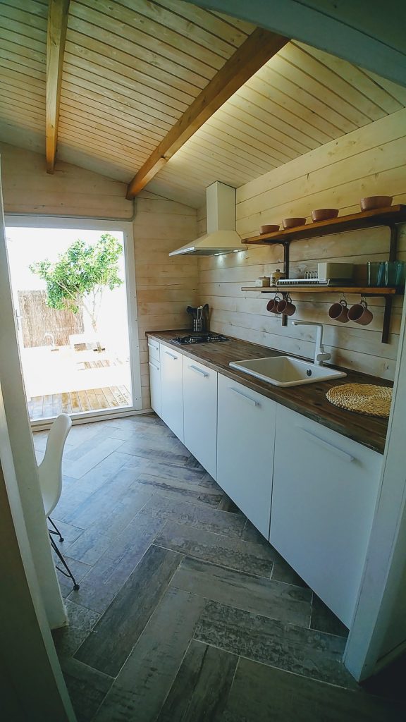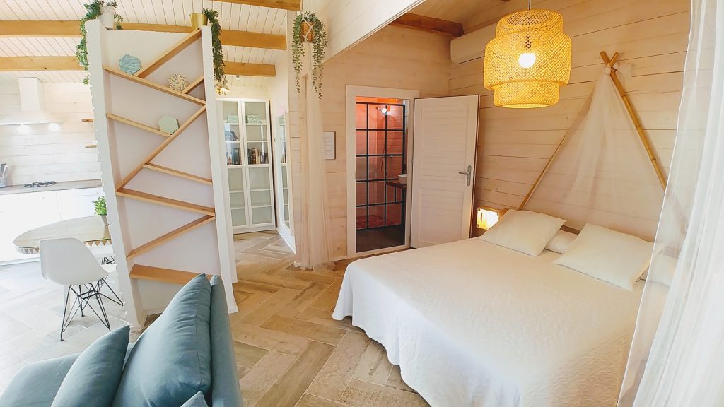 Luminosa cabaña situada en el Palmar de Vejer, a unos 10 minutos a pie de la playa. La cabaña de 36 m² es un espacio abierto (excepto el baño), equipada con cama de matrimonio de 150 cm (queen size), sofá de tres plazas, si lo hace cama es individual. Capacidad para 3 adultos o dos adultos con dos niñ@s pequeñ@s.
