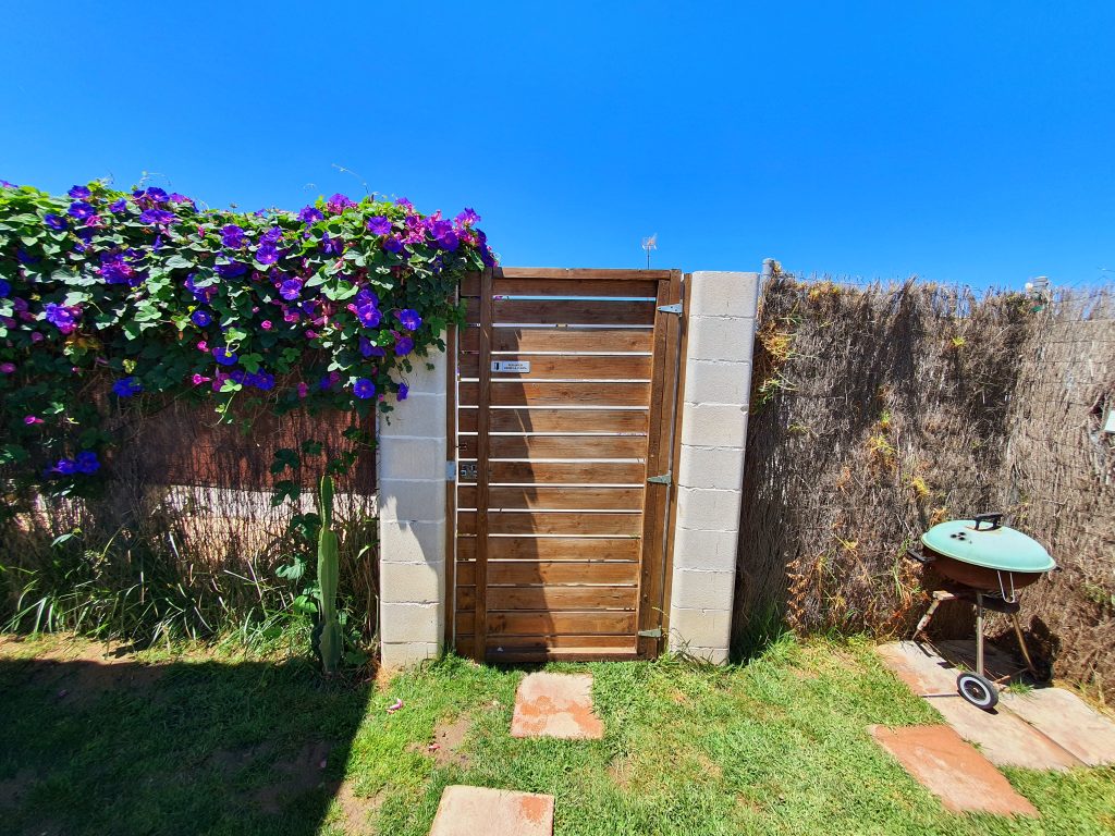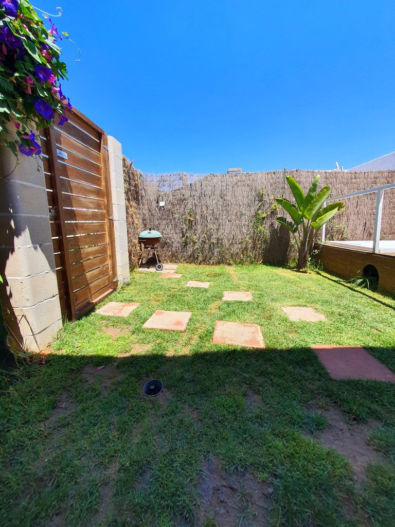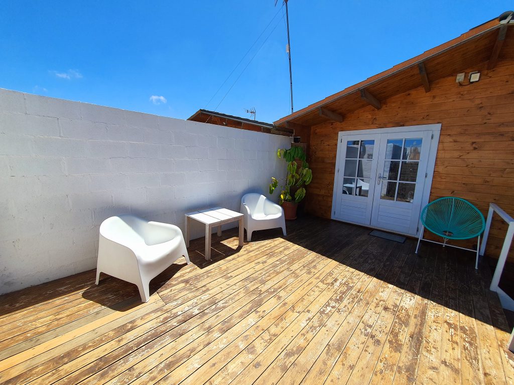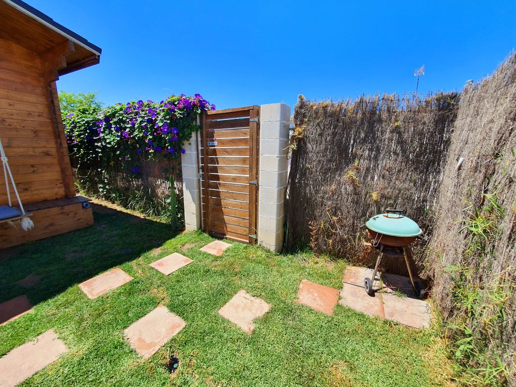 El jardín con aproximadamente unos 35 m² está vallado y tiene un porche de madera de 18 m² además de una pequeña zona de césped artificial. Encontrarás una barbacoa portátil, mesa y sillas exteriores.