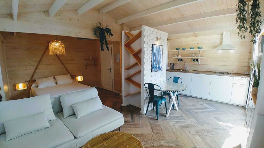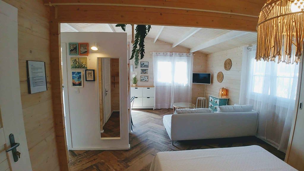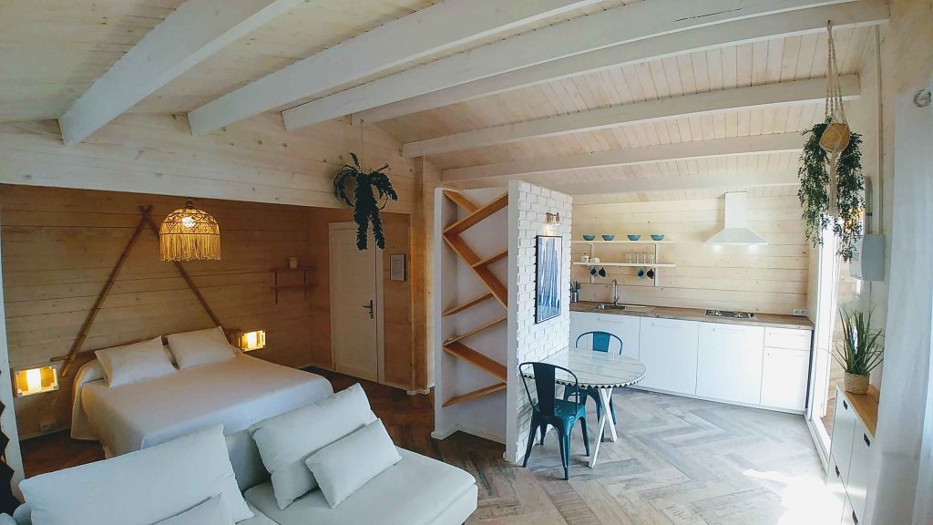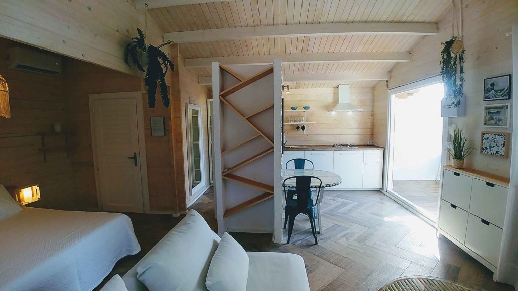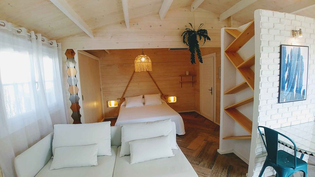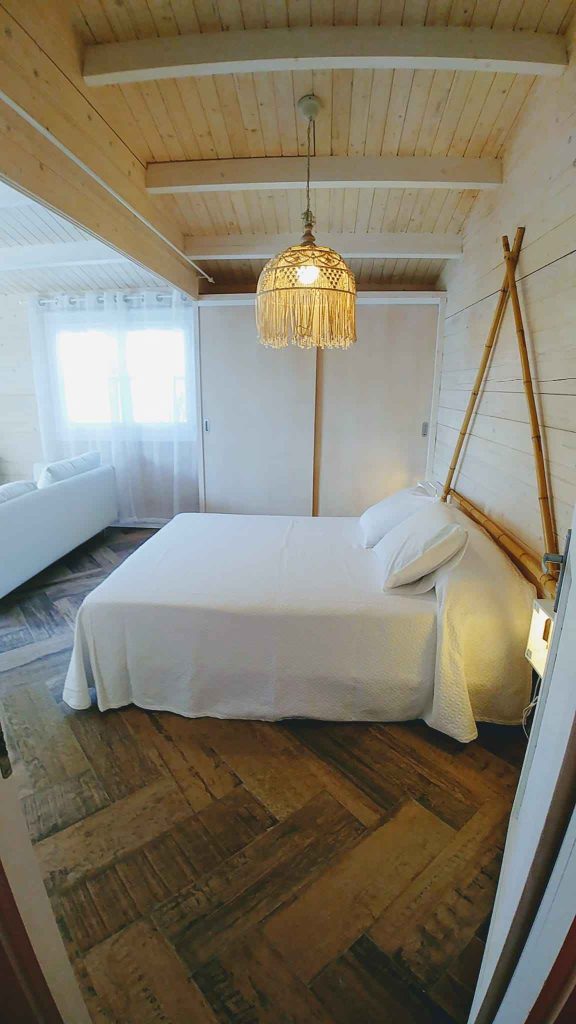 Tiene unos 36 m², de espacio abierto (excepto el baño). Cuenta con cama de matrimonio de 150 (queen size); sofá de tres plazas, que si se hace cama, es individual. Capacidad para un máximo de 3 personas, o dos adultos con dos niñ@s pequeñ@s.