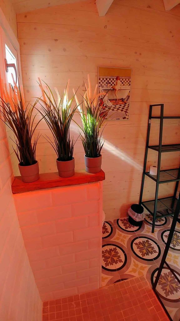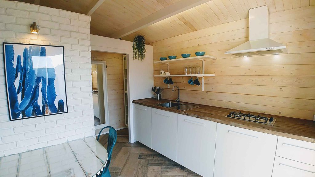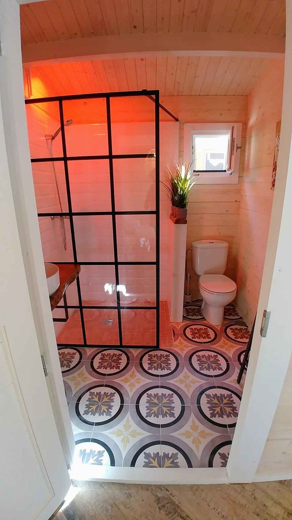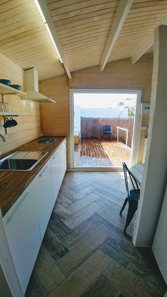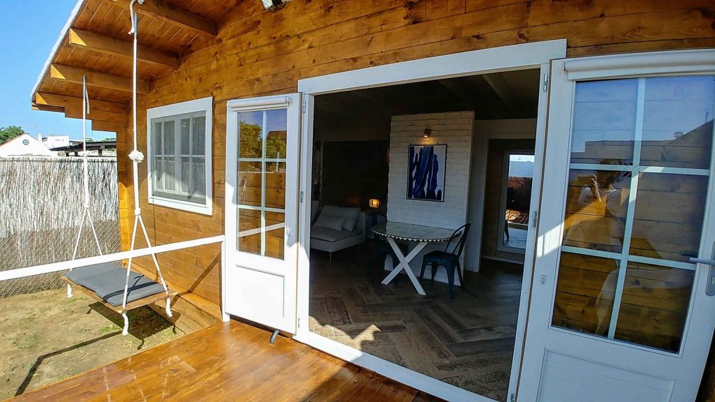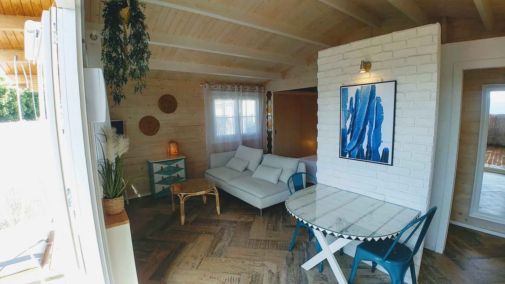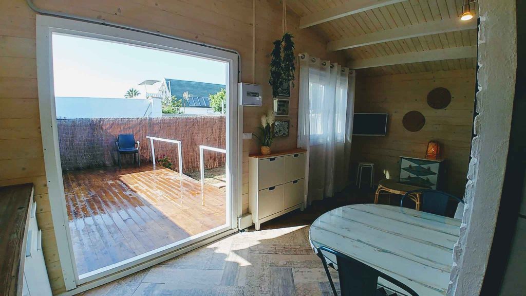 El baño está dentro de la casa. Tiene cocina americana, aire acondicionado, calefacción, Wi-Fi y televisión plana de 32″. El jardín con aproximadamente unos 35/40 m² está vallado y es privado, tiene un porche de madera de 18 m² y una pequeña zona de césped natural, barbacoa portátil, mesa y sillas de exterior.